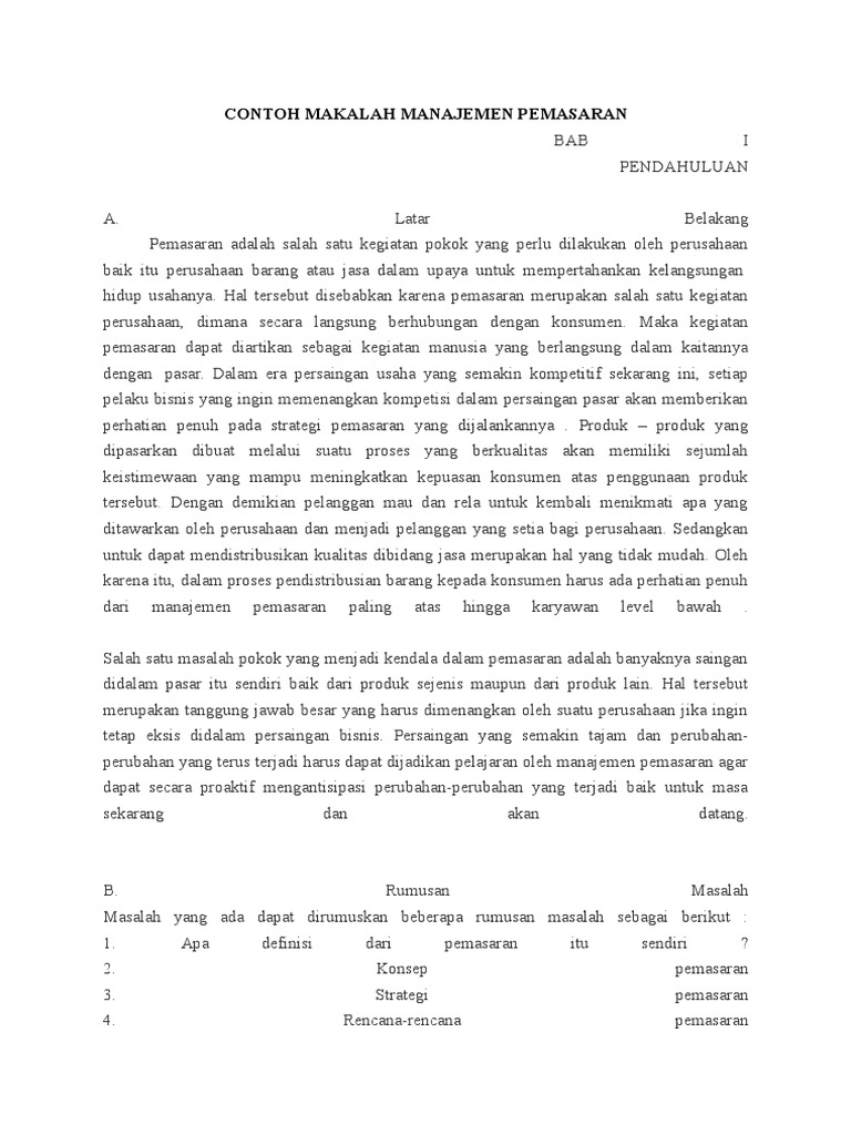 Contoh Rumusan Masalah Pemasaran : Agar lebih memahami mengenai rumusan masalah, perhatikan contoh rumusan masalah berikut:. Latar belakang dan motivasi berbisnis. Bagaimana cara menekan biaya produksi tanpa mengesampingkan kualitas produk makanan? Contoh makalah riset pemasaran produk latar belakang contoh makalah riset pemasaran produk rumusan masalah tujuan dan manfaat penelitian sistematika penulisan pengertian pemasaran contoh makalah riset pemasaran produk Rumusan masalah masalah yang ada dapat dirumuskan beberapa rumusan masalah sebagai berikut : Apa bentuk promosi yang dapat dilakukan untuk menarik minat konsumen?