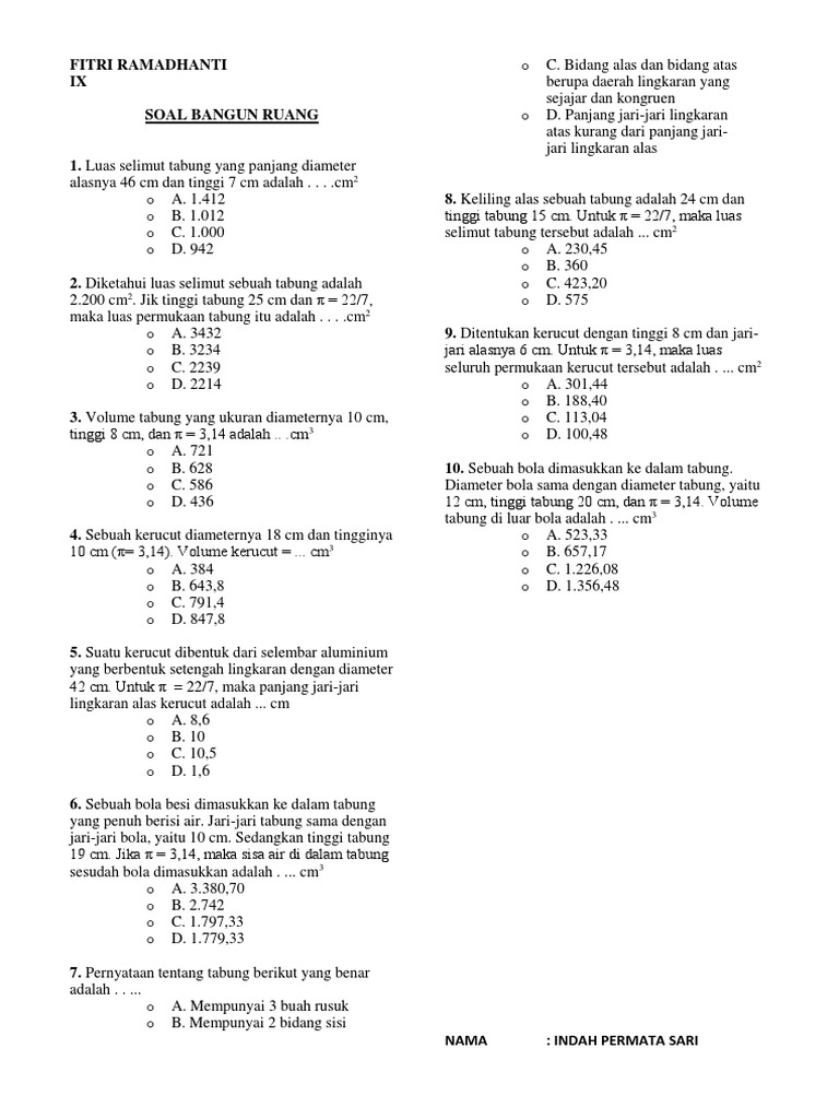 Uas Ix from imgv2-2-f.scribdassets.com Diameter = 30 cm, karena r = 1/2 diameter maka r = 15 cm tinggi = 56 cm. Luas permukaan tabung = (2 x luas permukaan lingkaran) + luas permukaan persegipanjang = (2 x π r²) + 2 πrt = 2 πr (r+t). 3.sebuah tabung dengan panjang jari jari 14 cm tinggi 28 cma.volume.b.luas sisi permukaan.plis cepet jawab besok di kumpulin. Luas permukaan bangun = luas alas + luas selimut tabung + luas setengah bola = pi x r² + 2 x pi x r x t + 1/2 x 4 x. Panjang garis tepi cone 15 cm. Luas permukaan suatu bangun adalah jumlah luas semua sisinya. Jadi luas permukaan pada tabung tersebut adalah 2214 cm2. Jari jari =7 cm tinggi= 15 cm ditanya: